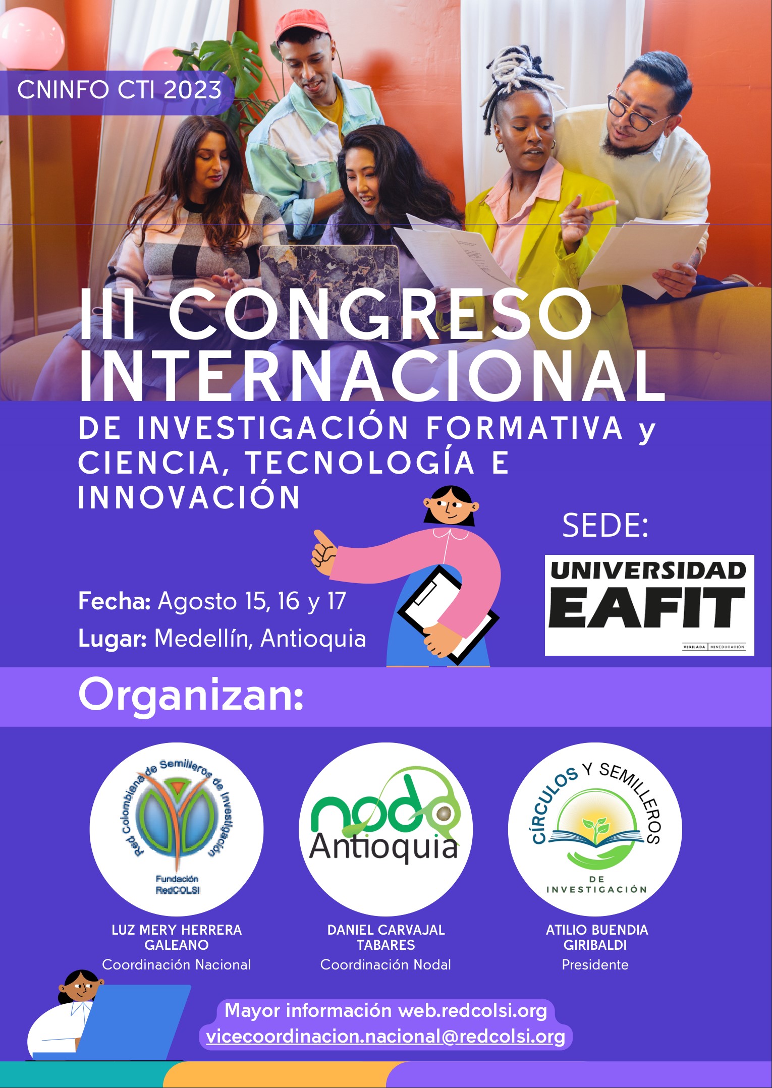 La Fundación Red Colombiana de Semilleros de Investigación (RedCOLSI) es una organización sin ánimo de lucro, legalmente constituida en el territorio colombiano, que se articulada con la educación básica, secundaria, terciaria y superior, líder en la consolidación de una cultura investigativa fundamentada en la investigación formativa, la formación en investigación y el trabajo en red de semilleros de investigación, mediados por escenarios de socialización, gestión y apropiación social del conocimiento. La RedCOLSI realiza ‘III CONGRESO INTERNACIONAL DE INVESTIGACIÓN FORMATIVA y CIENCIA, TECNÓLOGIA E INNOVACIÓN, orientado a profesionales de las diferentes áreas del saber, egresados, docentes, especialistas, magister, y doctorados, esta versión se llevará a cabo de manera PRESENCIAL. En este congreso se abrirán escenarios para que los profesionales de nuestras instituciones y universidades puedan compartir las experiencias en investigación formativa y los avances en investigación desarrollados por sus grupos y semilleros de Investigación, los cuales representan para nuestra organización, la base de una sociedad innovadora, creativa y trasformadora, articulada a una comunidad académica de orden nacional e internacional dispuesta a trabajar en red. Los invitamos a participar en nuestro CNINFO CTI 2024.Valor: 610 us