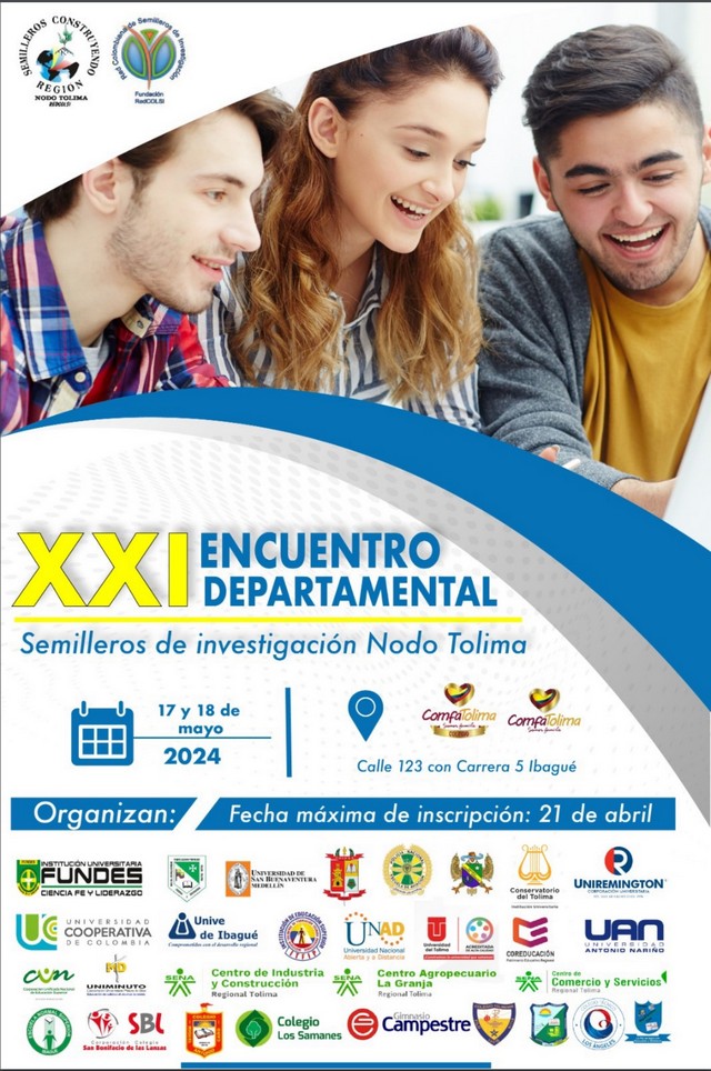 El Encuentro Departamental de Semilleros de Investigación es el espacio más importante creado por RedCOLSI en los Departamentos y/o Regiones, en el que confluyen los estudiantes acompañados por docentes para exponer los avances de sus investigaciones de corte formativo. El objetivo principal de este encuentro es generar un espacio dinámico e integral de socialización, aprendizaje y discusión de la investigación de los semilleros para cualificar su labor, fortalecer el trabajo en red y el intercambio de actividades de formación de estudiantes investigadores. Esta puesta en común permitirá la evaluación y cualificación del trabajo desarrollado y la conformación de las redes temáticas que apunten al desarrollo de la región. La RedCOLSI Nodo Tolima de la Fundación Red Colombiana de semilleros de investigación, realizará los días 17 y 18 de mayo el XXI Encuentro Departamental de Semilleros de Investigación RedCOLSI Nodo Tolima-EDESI 2024, “Investigación, Innovación y Emprendimiento Comprometidos con las Necesidades de la Región.”, en el que se presentarán las propuestas y proyectos enmarcados en el tema Investigación, Innovación y Emprendimiento Comprometidos con las Necesidades de la Región., que se desarrollan al interior de los semilleros de investigación de las diferentes instituciones vinculadas al Nodo Tolima. Para el desarrollo de este encuentro RedCOLSI Nodo Tolima cuenta con el apoyo de jurados evaluadores reconocidos y con experiencia en su campo y con las instituciones educativas vinculadas y otras instituciones asociadas a la RedCOLSI en Colombia.Valor: Ponentes educación básica, media $40.000 Ponentes técnica o superior $50.000 Asistentes $25.000 Profesionales $60.000