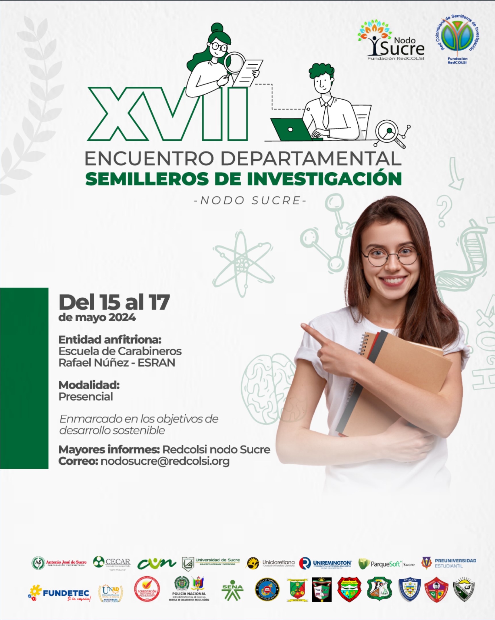 La Fundación Red Colombiana de Semilleros de Investigación (RedCOLSI) es una organización sin ánimo de lucro, legalmente constituida en el territorio colombiano, que articulada con la educación básica primaria, secundaria, media, terciaria y superior, líder en la consolidación de una cultura investigativa fundamentada en la investigación formativa, la formación en investigación y el trabajo en red de semilleros de investigación, mediados por escenarios de socialización, gestión y apropiación social del conocimiento La red colombiana de semilleros de investigación del Nodo Sucre y la Corporación Universitaria Antonio José de Sucre - UAJS, como coordinación encargada del Nodo, tiene el agrado de compartir la Convocatoria del XVII Encuentro Departamental de Semilleros de Investigación, evento que permite visibilizar los resultados de los semilleros de investigación, lo cual servirá como preámbulo y requisito para obtener el aval para participar en el Encuentro Nacional e Internacional de Semilleros de Investigación. De igual forma, se exalta el reconocimiento a la labor de los delegados institucionales, por fomentar la cultura investigativa en el departamento de Sucre, formando integralmente en investigación a nuestros niños, niñas y jóvenes, lo que contribuye a mejorar los indicadores regionales, aportando a los procesos de calidad de las Instituciones de acuerdo con los estándares nacionales. En ésta oportunidad, nos enfocamos en los objetivos de desarrollo sostenible, con el propósito de generar espacios de circulación y apropiación social de conocimiento con relación a procesos de investigación, buenas prácticas y herramientas para el análisis de las contribuciones e impactos en los campos de los Objetivos de Desarrollo Sostenible y la Responsabilidad Social.Valor: Instituciones de educación superior: $ 80.000 Instituciones de básica primaria y secundaria: $ 60.000