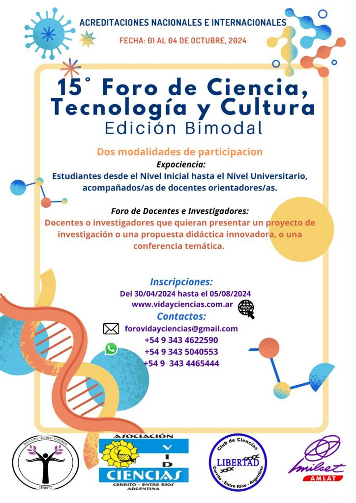 15° Foro de Ciencia, Tecnología y Cultura para proyectos de investigación de nivel primario, secundario y superior. Nacionales e Internacionales. Modalidad ExpocienciaValor: 0$